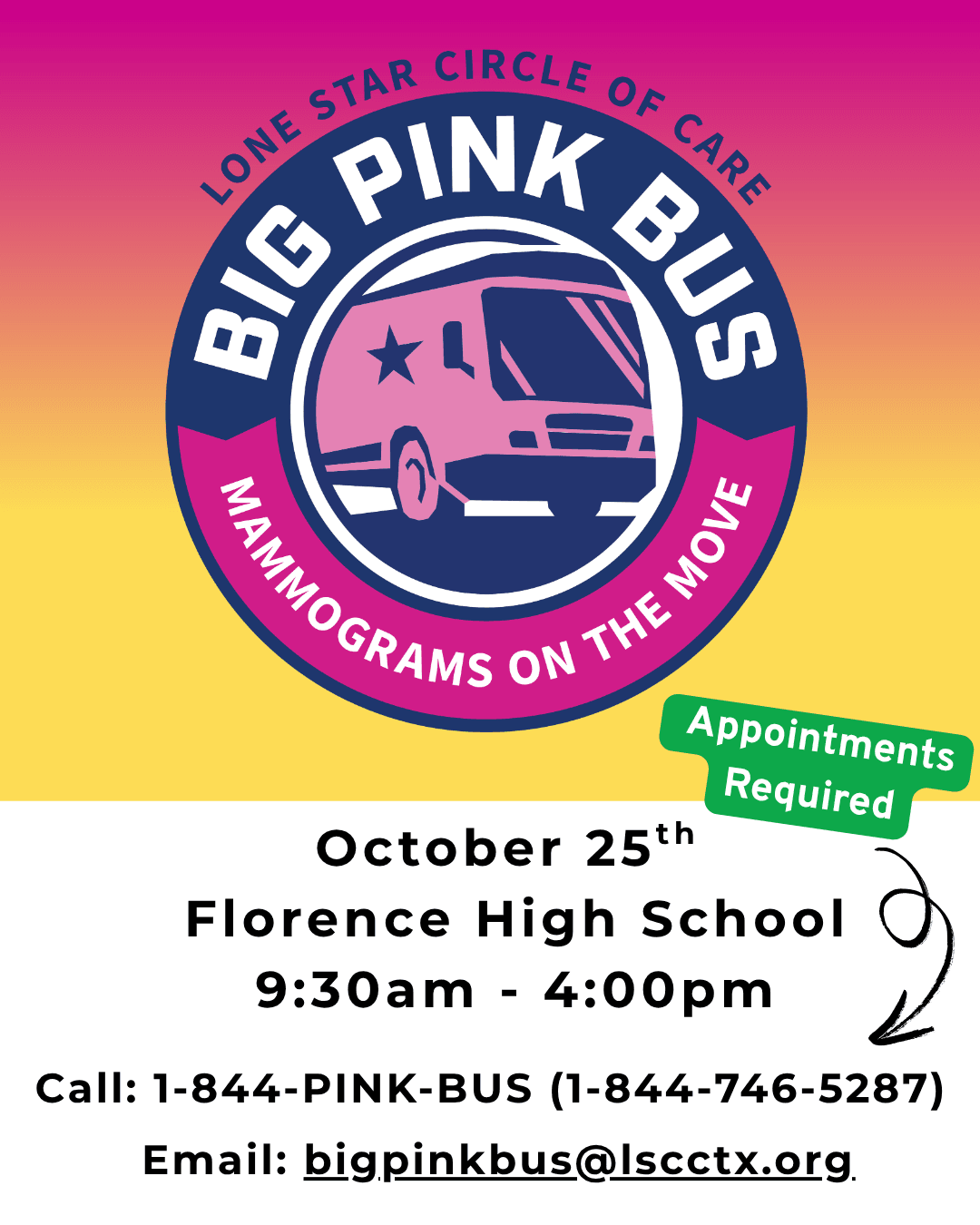 Did you know that HCCM has hosted the Big Pink Bus at our own Thrift Store, and also at 2 of our Fresh Food for All locations? We will also be hosting the Big Pink Bus at our Florence Fresh Food for All distribution on October 25th. This will be located at Florence High School: 401 FM 970, Florence, TX. 9:30 am – 4pm.